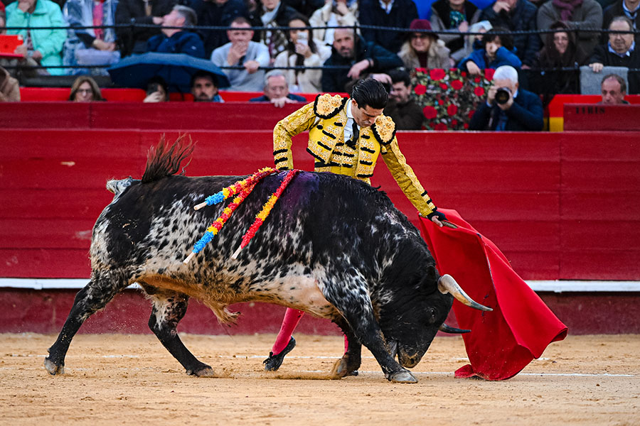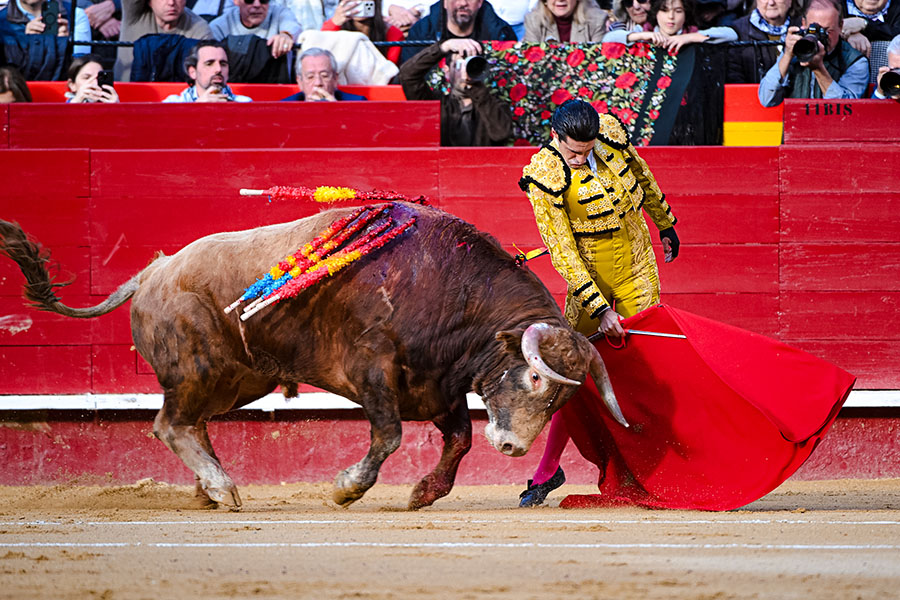 En su primer toro aparecieron algunos pasajes de gran expresión estética. Hubo naturales de trazo limpio, templados, donde la muleta parecía deslizarse con suavidad por la embestida. Sin embargo, la faena nunca llegó a adquirir una arquitectura sólida. El toro marcaba querencias y el torero optó por acompañar ese comportamiento en lugar de imponerle una dirección más clara. El resultado fue una obra fragmentaria, compuesta por momentos sueltos que el público celebró pero que no terminaron de construir una faena redonda.